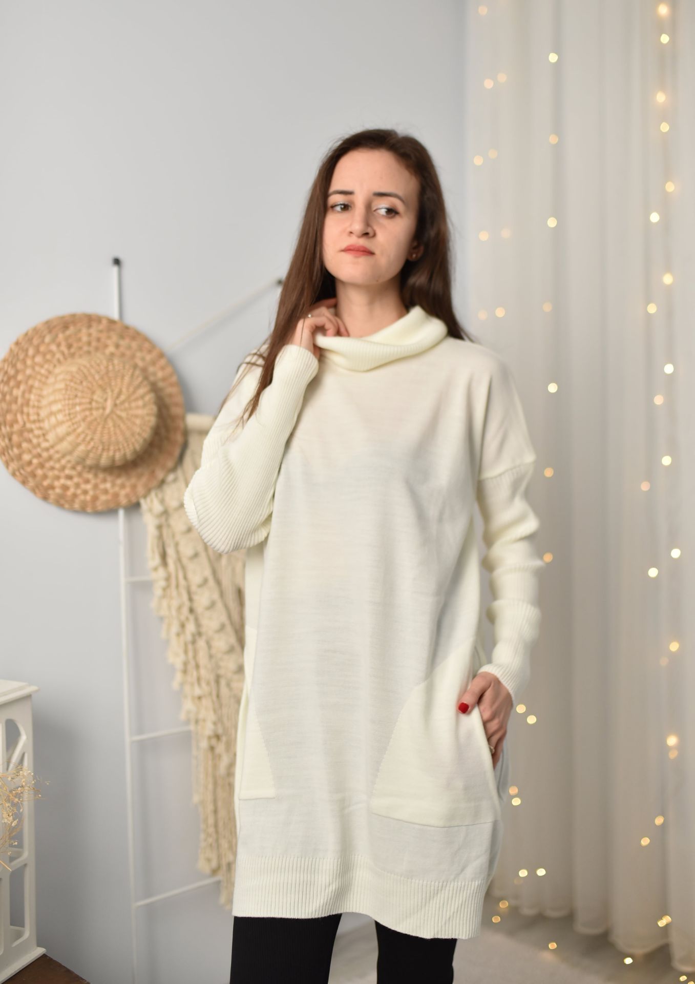 5382 Şal Yaka Beyaz Uzun Cepli Tunik